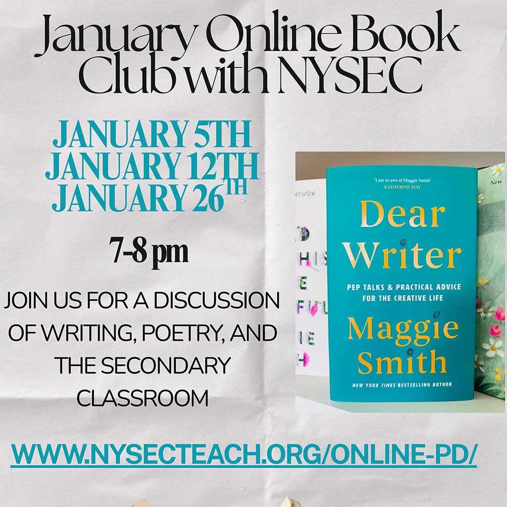 About: Maggie Smith’s viral poem “Good Bones” made its debut on social media in 2017. Maggie Smith, accomplished poet and poetry professor, was thrown into the spotlight and her four poetry collections remained at the top of every poetry lover’s TBR. In her newest memoir, Dear Writer, Smith speaks directly to educators and poets as lovers of verse. She brings practical thought to our creative practice and has a bounty of advice in the realm of attention, wonder, vision, vulnerability, tenacity, and hope. The sessions will be set up as a 10-minute discussion, 10-minute writing session, 20-minute lesson and 10-minute share-out. We hope to break out into small groups as needed and encourage both small and large group discussion. Each session will review about 1/3 of the text and the last session will offer longer writing and planning time for classroom implementation.